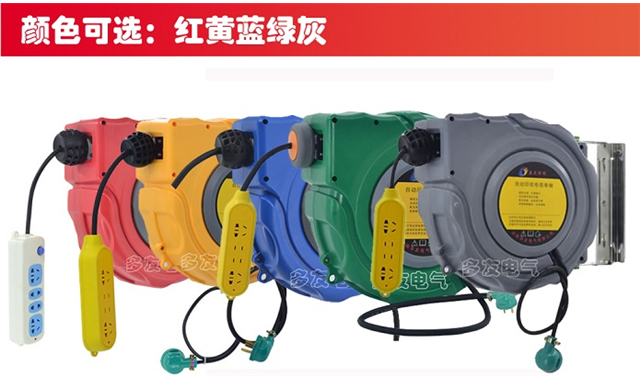 自动收放线盘的输入端为插头,无自动收放机能,外接220v或380v电源。自动可伸缩电缆卷轴输出端的电源线具备可伸缩功用和自锁装置。拔出电缆后,将电缆拔出一段时间后,自动电缆卷盘的自锁装置开始卡住电缆。如果需缩回电缆,则应拉出电缆的一部分以使电缆通过自锁设备并自动获释电缆,电缆将当即自动缩回。