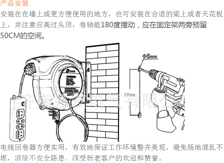 自动卷线器用以便捷工作和提高效率,因此不需要很高的工作条件,并且对各种工作环境兼具很强的适应性,首先可以实现360度无障碍安装自动卷线器可以随意角度安装使用,可以适于任何角度的工作需要;其次,安装后可以180度左右转动,更进一步优化了工作环境;第三,自动卷线器可以程度固定或垂直方向不落下,这在特别条件下便于正常使用。